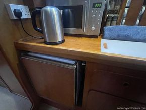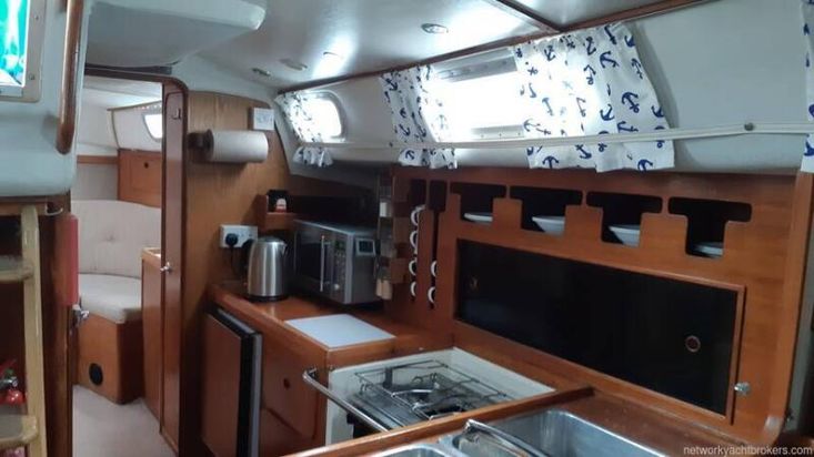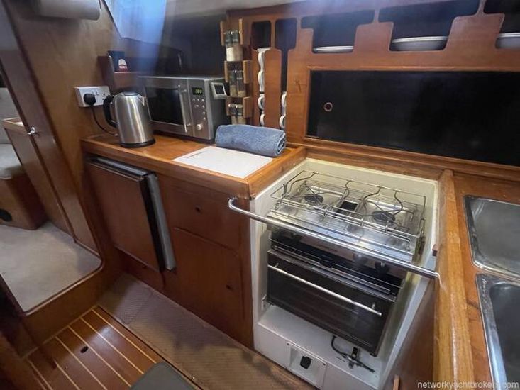 Below Deck; At the foot of the companionway lies a spacious galley area and main cabin, Forward of this, there is storage to port and the heads compartment opposite. Through a door lies the forward cabin with berths to both sides with an infill piece to make a double berth. A passage on the port side passes the galley leading to the spacious self-contained after cabin, with vanity unit and hanging locker. All the accommodation is lit by LED lighting.